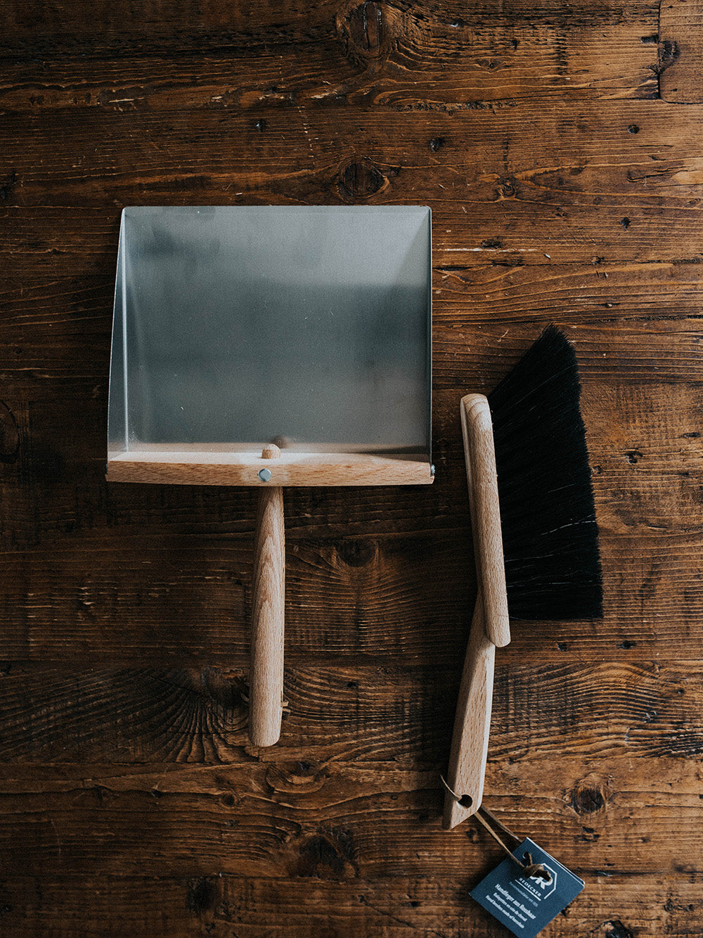 Redecker's versatile dust pan and brush set includes a horsehair brush and a stainless steel dustpan, both featuring oiled beechwood handles. A clever magnet conveniently connects the hand brush to the dustpan for easy storage. Handmade in Germany by Redecker.