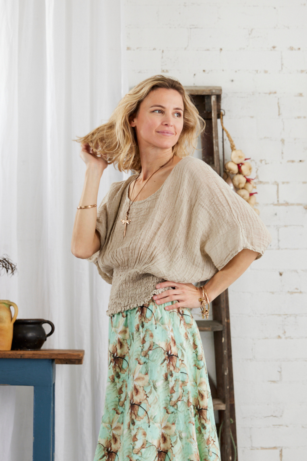 This linen top from La Bottega di Brunella is soft, lightweight and easy to wear. Its gathered waist and relaxed fit make it a versatile piece, ideal for pairing with flowing skirts or casual pants for a simple yet stylish look.
